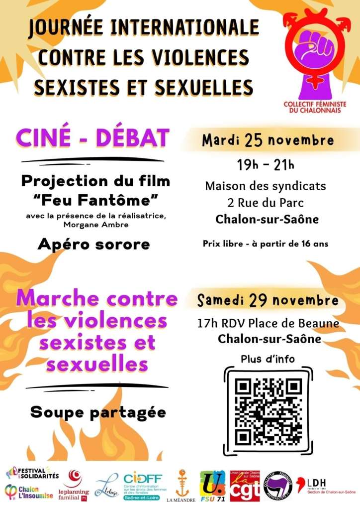 Dans le cadre de la journée internationale de lutte contre les violences sexistes et sexuelles et du festival Festisol (dont le programme est ici), le collectif féministe du chalonnais dont la FSU 71 est membre propose une soirée ciné-débat le mardi 25 novembre de 19 à 21h et une marche suivie d’une soupe partagée le samedi 29 novembre à 17h au départ de la place de Beaune :
