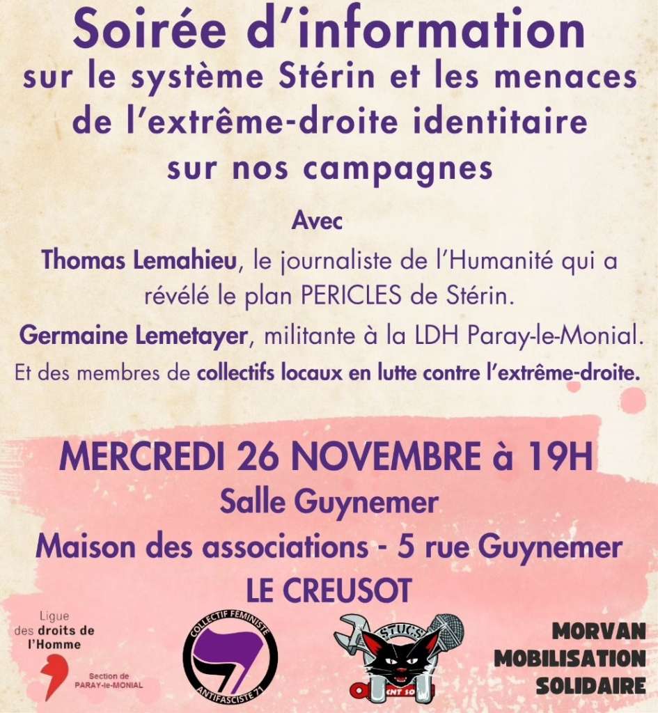 En partenariat avec la LDH Paray-le-Monial et des collectifs locaux en lutte contre l’extrême droit, le collectif Morvan Mobilisation Solidaire organise une soirée d’information le mercredi 26/11 à la maison des associations du Creusot, 5 rue Guynemer :