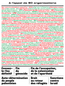 Auto-détermination du peuple palestinien qui doit être l’acteur de son propre destin et droit au retour des réfugiés palestiniens Fin de occupation, de la colonisation, de l’apartheid Sanctions contre Israël Cessez-le-feu définitif et fin du génocideJUSTICE POUR LA PALESTINE – STOP GÉNOCIDE